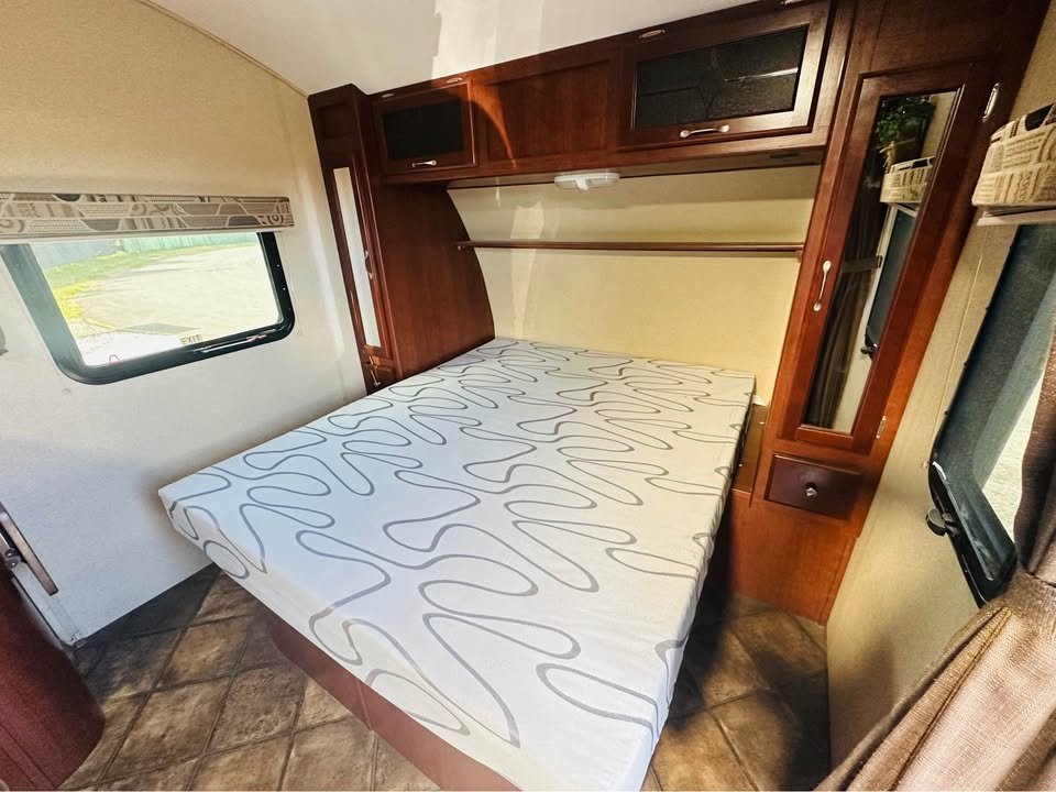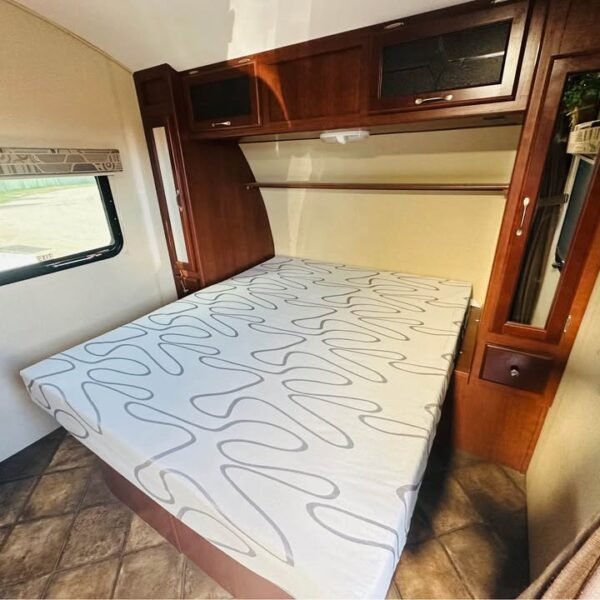 Quarto: Cama Queen size fixa, Armários laterais com espelho, Espaço sob a cama para armazenamento, Cortina de privacidade