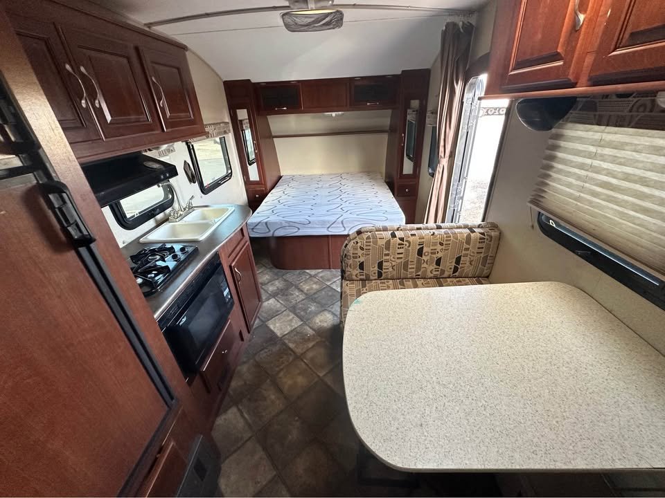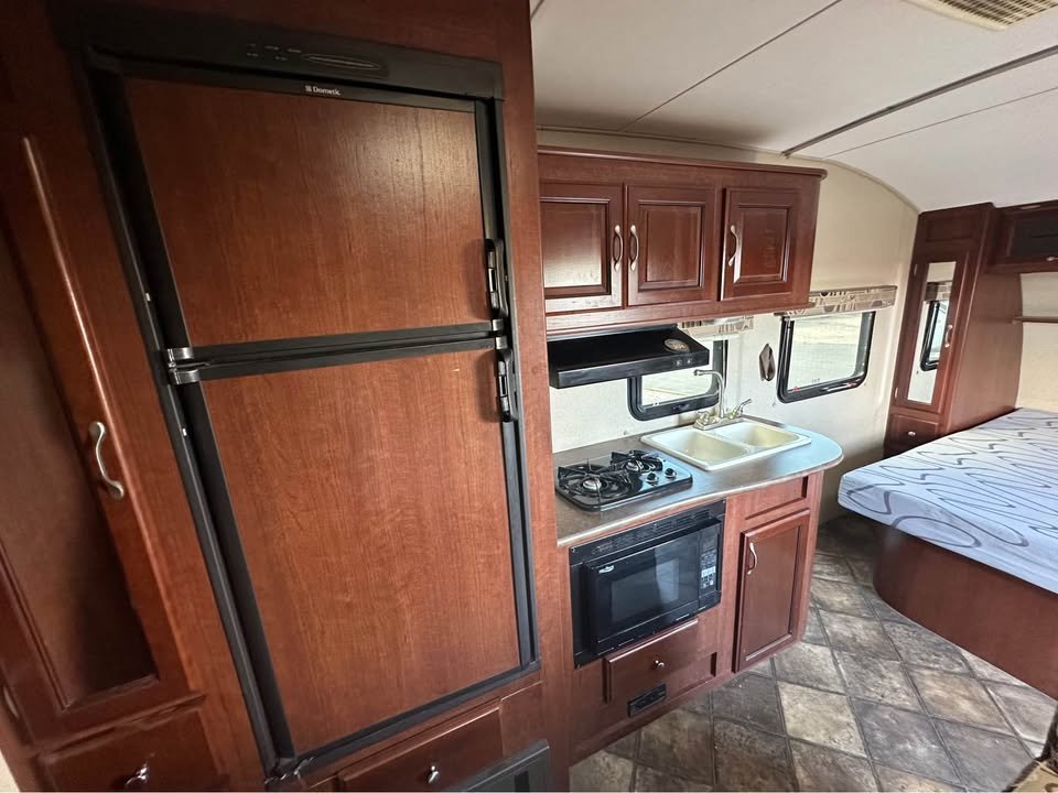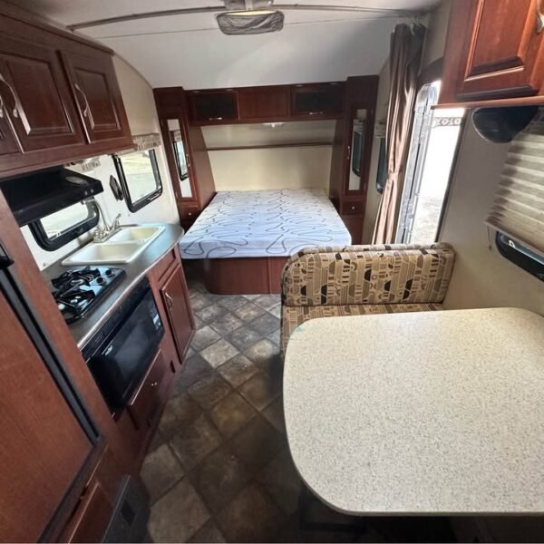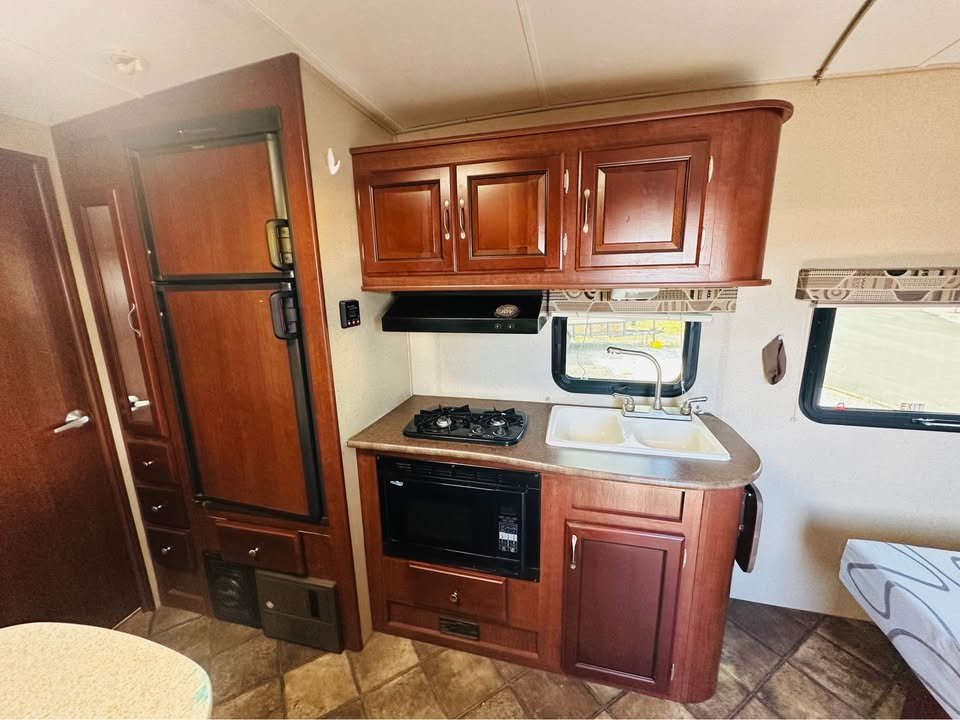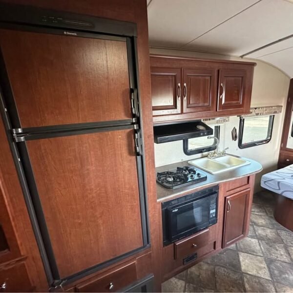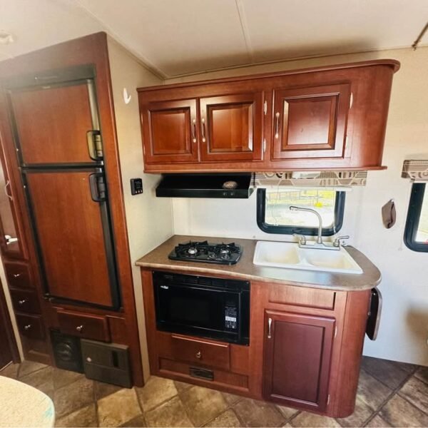 Cozinha: Geladeira de 2 portas (elétrica e gás propano), Fogão de 2 bocas com forno micro-ondas, Pia de aço inox com tampa para aumentar bancada, Armários superiores e inferiores em madeira, Bancadas em material laminado resistente