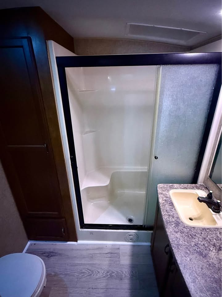 Banheiro: Box de chuveiro grande com porta de vidro, pia com armário, vaso sanitário de porcelana, exaustor de teto