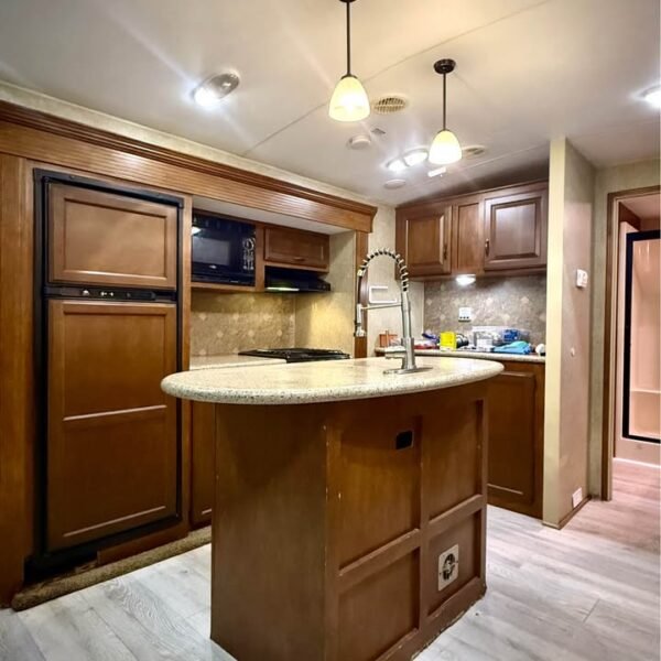 Cozinha Interna: Geladeira a gás/eletricidade, Fogão 3 bocas com forno, Micro-ondas, Pia dupla em inox, Armários superiores e inferiores